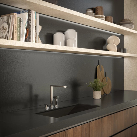 Atlas Plan Black Lava Leathered cechuje się unikatowym wykończeniem „Leathered”, które nadaje powierzchni subtelny, teksturowany efekt przypominający naturalną skórę. To wykończenie nie tylko przyciąga wzrok, ale również zwiększa odporność materiału na zarysowania i uszkodzenia, gwarantując długotrwałą estetykę.