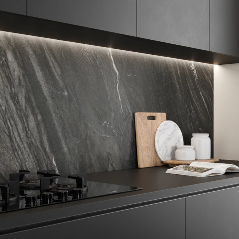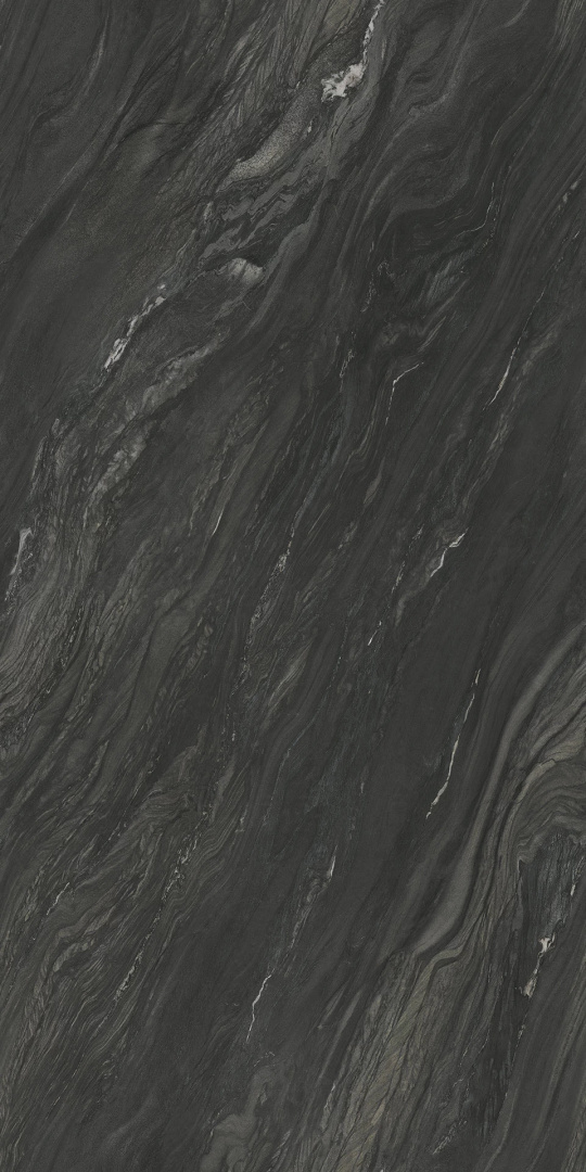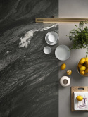 Black Tempest to płyta, która oddaje esencję burzowego nieba – głęboka czerń zostaje tu przełamana przez dynamiczne żyłki w odcieniach bieli, jasnego grafitu i stalowego srebra. Tworzy to kompozycję idealnie imitującą strukturę kamienia naturalnego, a przy tym pozostaje w pełni kontrolowana, dzięki czemu każdy projekt z jej użyciem zachowuje spójność i estetyczną harmonię.