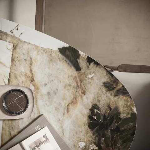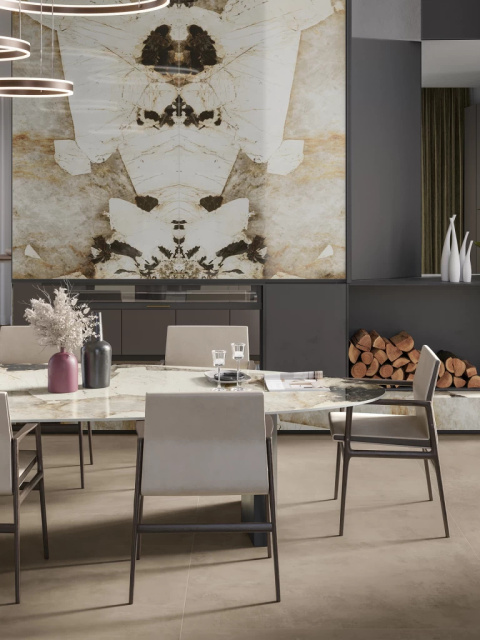 Dzięki polerowanemu wykończeniu powierzchnia spieku odbija światło, tworząc efekt głębi i luksusu. Desert Soul występuje również w wersji silk, która oferuje satynowe wykończenie, bardziej matowe i subtelne. Obie opcje pozwalają na dopasowanie materiału do różnych stylów wnętrzarskich – od minimalistycznych po bardziej tradycyjne.