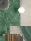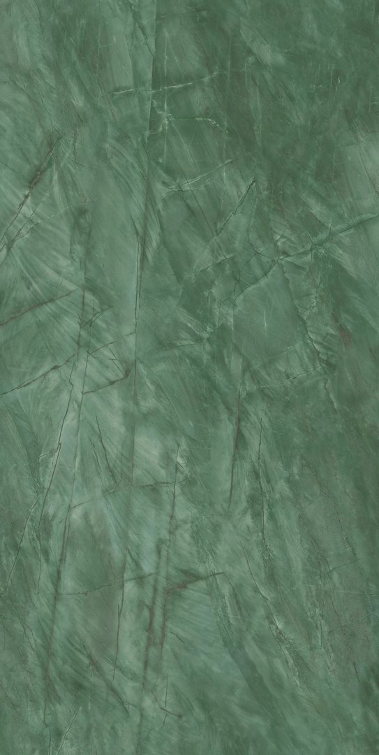 W połączeniu z symetrycznym ułożeniem żył w stylu bookmatch, zieleń staje się dynamiczną, a zarazem wyważoną kompozycją, która przypomina dzieło sztuki stworzone przez samą naturę.