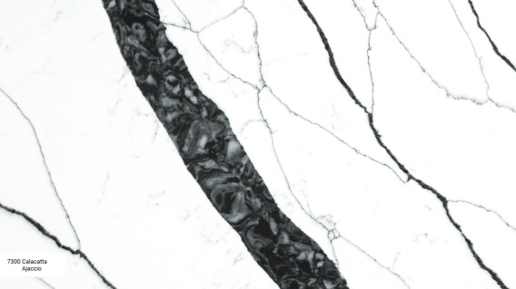 Avant Quartz Calacatta Ajaccio to biały konglomerat kwarcowy z kontrastowymi czarnymi żyłkami, tworzący elegancki i wyrazisty wzór. Polerowana powierzchnia i grubość 20 mm czynią go idealnym do nowoczesnych projektów.