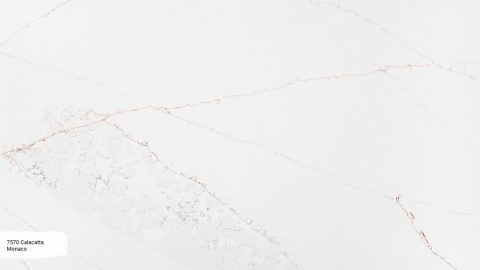 Avant Quartz Calacatta Monaco to biały konglomerat kwarcowy z nieregularnym użyleniem w odcieniach miedzi i szarości oraz jasnymi skupiskami mineralnymi. Polerowane wykończenie i grubość 20 mm czynią go idealnym wyborem do nowoczesnych wnętrz.