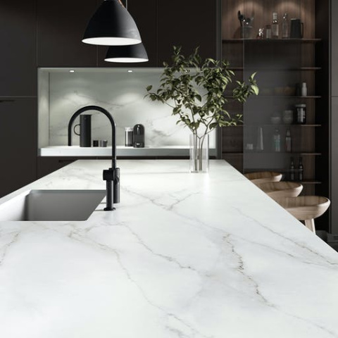 Dekton Rem kC w grubości 12 mm to luksusowa propozycja inspirowana marmurem Calacatta. Białe tło urozmaicone jest beżowo-szarymi żyłami, które tworzą elegancki i dynamiczny rysunek, nadając powierzchni szlachetności i wyjątkowej głębi. Dzięki strukturze teksturowany velvet powierzchnia jest aksamitna, matowa i przyjemna w dotyku, podkreślając naturalny, ponadczasowy charakter spieku.