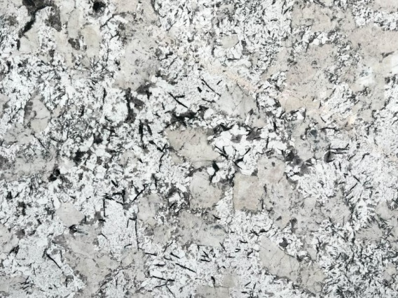 Granit Andorra to wyjątkowy kamień naturalny, który wyróżnia się jasną, elegancką kolorystyką i niepowtarzalnym wzorem. Dominują w nim odcienie bieli i szarości, przełamane subtelnymi beżowymi tonami oraz ciemniejszymi akcentami mineralnymi. Struktura materiału jest dynamiczna – widoczne są wyraźne kryształy i nieregularne użylenia, które nadają każdej płycie indywidualny charakter.