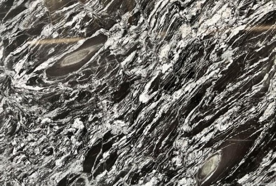 Granit Oscuro Mist szczotkowany to efektowny, ciemny kamień naturalny o wyrazistym, falistym rysunku. Na grafitowo-czarnym tle pojawiają się nieregularne, jaśniejsze żyły, które tworzą dynamiczny, niemal „malowany” wzór. Wykończenie szczotkowane (brushed) nadaje powierzchni satynowy mat, delikatną strukturę i przyjemne w dotyku wykończenie, jednocześnie podkreślając naturalny charakter kamienia.