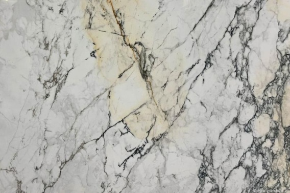 Marmur Calacatta Paonazzo to wyjątkowo szlachetny kamień naturalny o jasnym, białokremowym tle z mocnym, dekoracyjnym użyleniem. Charakterystyczne są gęste szaro-czarne żyły połączone z złotymi i beżowymi plamami, które tworzą efekt „pękniętego” rysunku. Każda płyta wygląda jak obraz malowany przez naturę – Calacatta Paonazzo od razu przyciąga wzrok i nadaje wnętrzu luksusowy charakter.