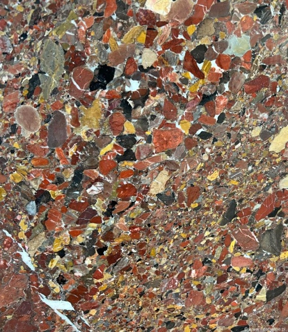 Marmur Teracco to niezwykle dekoracyjny kamień o intensywnej, ciepłej kolorystyce. Powierzchnia zbudowana jest z wielu nieregularnych fragmentów w odcieniach czerwieni, cegły, żółci, beżu i szarości, połączonych jasnymi żyłkami. Dzięki temu każdy slab tworzy efekt mozaiki i staje się mocnym, eleganckim akcentem we wnętrzu.