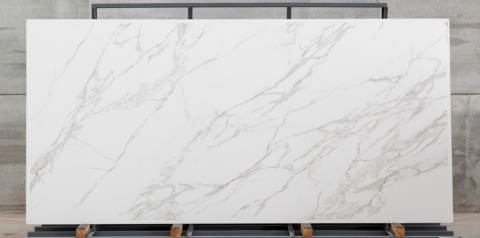 Kamień spiekany Calacatta C01 o grubości 6 mm. Wykończenie silk.