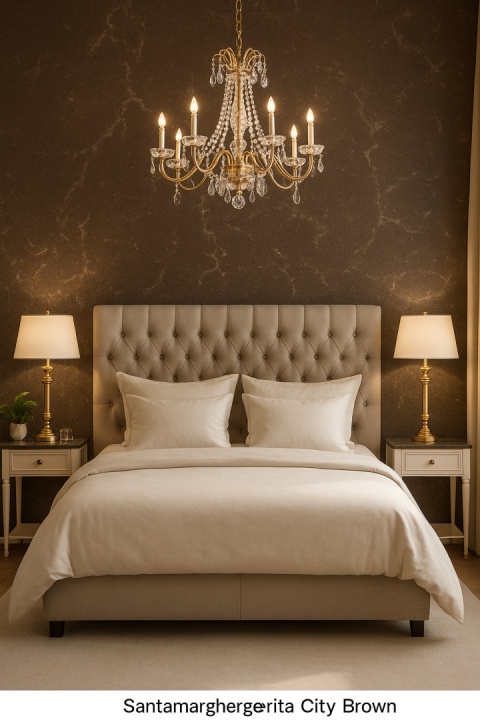 Santamargherita City Brown 2 cm to polerowany konglomerat kwarcowy w ciepłym brązie, w dużym formacie 320x155 cm. Idealny na blaty, ściany, podłogi i stoliki. Dostępna także wersja silk – za dopłatą.