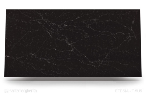 Santamargherita Etesia 2 cm grubości, rozmiar płyty 330 cm x 165 cm. Ciemny konglomerat o eleganckiej czerni z subtelnym, białym żyłkowaniem. Idealny na nowoczesne blaty kuchenne, łazienkowe i dekoracyjne ściany. Grubość 2 cm zapewnia lekkość i precyzję montażu.