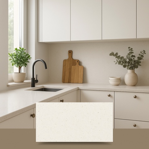 Santamargherita Helsinki w wersji 3 cm to konglomerat o nowoczesnym charakterze, wyróżniający się jasnobeżową, niemal kremową bazą z subtelnym, ziarnistym rysunkiem. Wtopione w strukturę powierzchni drobiny kwarcu o zróżnicowanej refleksyjności nadają płycie wrażenie głębi i lekkiego połysku. Helsinki doskonale odnajduje się w aranżacjach, gdzie dominują jasne barwy i stonowana elegancja – w stylistyce skandynawskiej, modern classic, japandi lub soft loft.