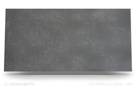 Metropolis Dark 2 cm to konglomerat kwarcowy o głębokiej, grafitowo-antracytowej barwie. Struktura płyty przypomina naturalne kamienie bazaltowe lub ciemne łupki, z delikatnie rozproszonymi, jasnoszarymi „mgiełkami” i ziarnistym rysunkiem, który dodaje materiałowi charakteru.