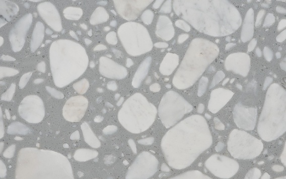 Santamargherita Palladio Griso to wyrazisty konglomerat marmurowy o chłodnej, szarej bazie, zdobionej dużymi, nieregularnymi wtrąceniami marmurowymi w odcieniach bieli. Układ kruszywa przywodzi na myśl tradycyjne lastryko w nowoczesnym wydaniu, a kontrast między jasnymi fragmentami marmuru a szarym tłem nadaje mu eleganckiego, ale jednocześnie naturalnego charakteru.