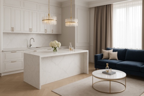 Bianco Venato 2 cm to idealna równowaga między elegancją wzoru a funkcjonalnością detali – lekkość, trwałość i estetyka mariażu bieli i szarości.