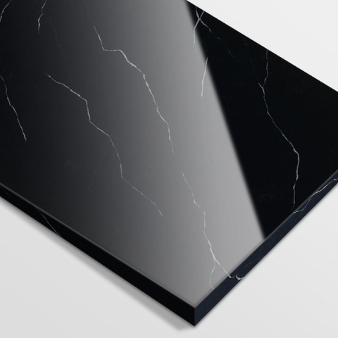 Polerowana powierzchnia dodatkowo uwydatnia kontrast między tłem a żyłkowaniem, podkreślając ekskluzywny wygląd materiału. Płyta SiQuartz Marquina Delicato w wersji 3 cm doskonale sprawdza się tam, gdzie potrzebny jest efekt masywności i trwałości – zarówno wizualnie, jak i funkcjonalnie.