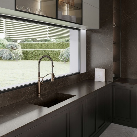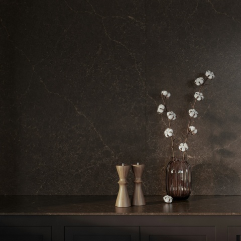 Silestone Chateau Brown to elegancki konglomerat kwarcowy, który wyróżnia się głębokim, czekoladowo-brązowym odcieniem wzbogaconym subtelnymi, jaśniejszymi żyłami. Jego wyrafinowana kolorystyka przywodzi na myśl szlachetne, naturalne marmury w ciemnej tonacji, dzięki czemu doskonale komponuje się zarówno w klasycznych, jak i nowoczesnych aranżacjach. To materiał stworzony dla tych, którzy pragną wprowadzić do wnętrza odrobinę luksusu, elegancji i przytulnego klimatu.