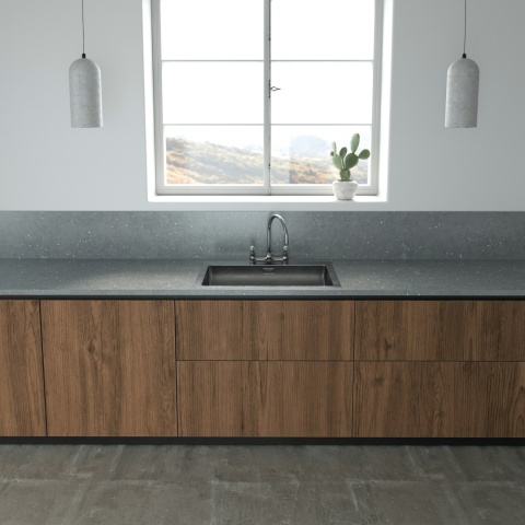 Silestone Ffrom 02 to średni szary konglomerat z serii Earthic, zaprojektowany we współpracy z pracownią Formafantasma. Charakteryzuje się głębokim szarym tłem przełamanym stylistycznymi, jasnymi elementami z recyklingowanego PET, które nadają powierzchni modny, minimalistyczny charakter .