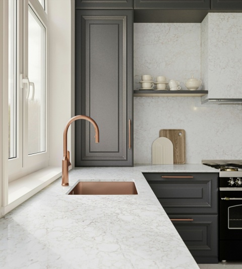 Silestone Riviere Rose to wyjątkowo subtelny, a zarazem nowoczesny konglomerat w pudrowo-różowym odcieniu z delikatnym wzorem żyłek. Ten elegancki materiał inspirowany estetyką paryskich wnętrz i klasycznym marmurem to propozycja dla tych, którzy chcą wprowadzić do swoich projektów nutę romantyzmu i wysmakowanego designu. Świetnie komponuje się z jasnymi, naturalnymi materiałami i złotymi akcentami.