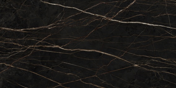 St. Laurent prezentuje czarne tło o intensywnej, niemal aksamitnej głębi, przecięte delikatnymi żyłkami o ciepłych, ziemistych tonach (ochra, brąz). Wykończenie matowe nadaje powierzchni subtelności, redukuje refleksy świetlne i podkreśla moc koloru oraz graficzny charakter wzoru.