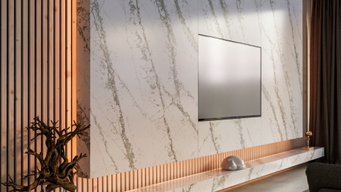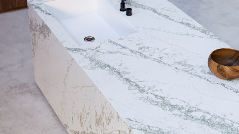 Technistone Verde Peak to konglomerat kwarcowy, który łączy w sobie elegancję marmuru z trwałością nowoczesnych materiałów. Jego jasnobiała, delikatnie marmurkowa powierzchnia, poprzecinana szaro-zielonymi żyłkami o różnej szerokości i odcieniu, nadaje wnętrzom świeżości i wyrafinowanego charakteru.