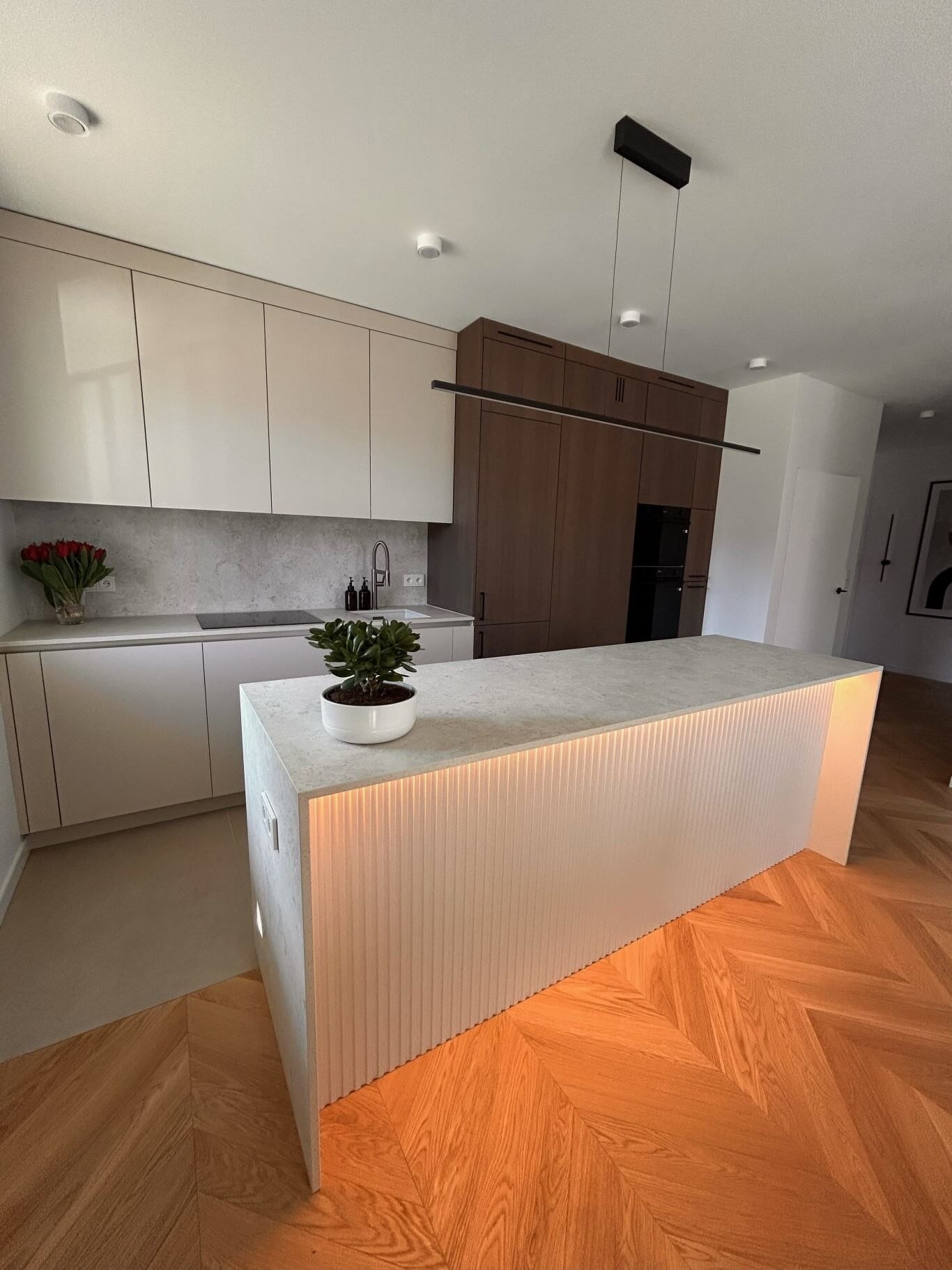 Ostatni, ale niezwykle ważny etap to montaż spieków kwarcowych. Wyjątkową uwagę poświęcono miejscu styku blatu ze zlewem – otwór pod zlew podwieszany został perfekcyjnie wycięty w spieku kwarcowym i obrobiony bez skaz. W przypadku wyspy kuchennej wykonano estetyczne połączenia pod kątem 45 stopni, co pozwoliło osiągnąć efekt monolitu — nie widać żadnych łączeń, całość prezentuje się elegancko i minimalistycznie. - Finalizacja i przekazanie projektu