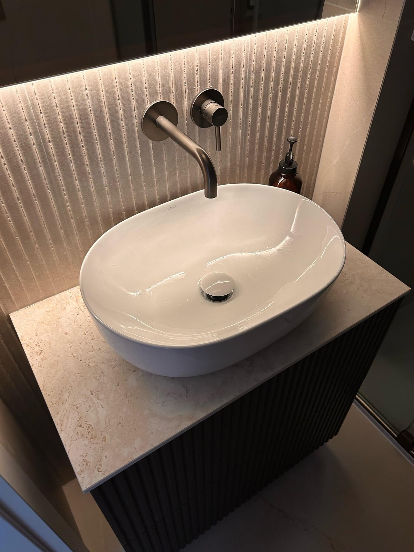 Po ustawieniu i wypoziomowaniu szafek kuchennych i łazienkowych nasz specjalista przyjechał na pomiar. To kluczowy etap — każdy milimetr ma znaczenie, zwłaszcza przy realizacjach z płyt wielkoformatowych. - Projekt techniczny i cięcie spieków