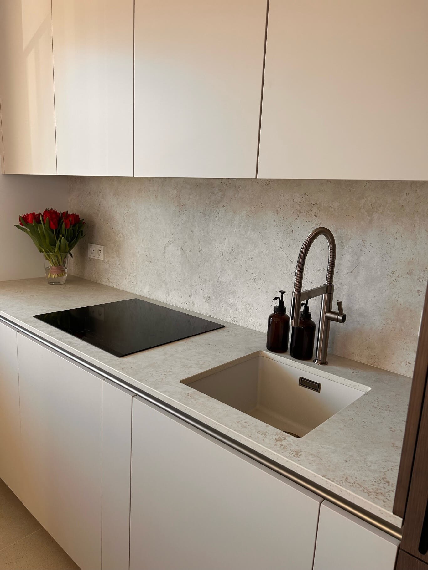 - Blat kuchenny ze spieku kwarcowego z miejscem na płytę indukcyjną i podwieszany zlew