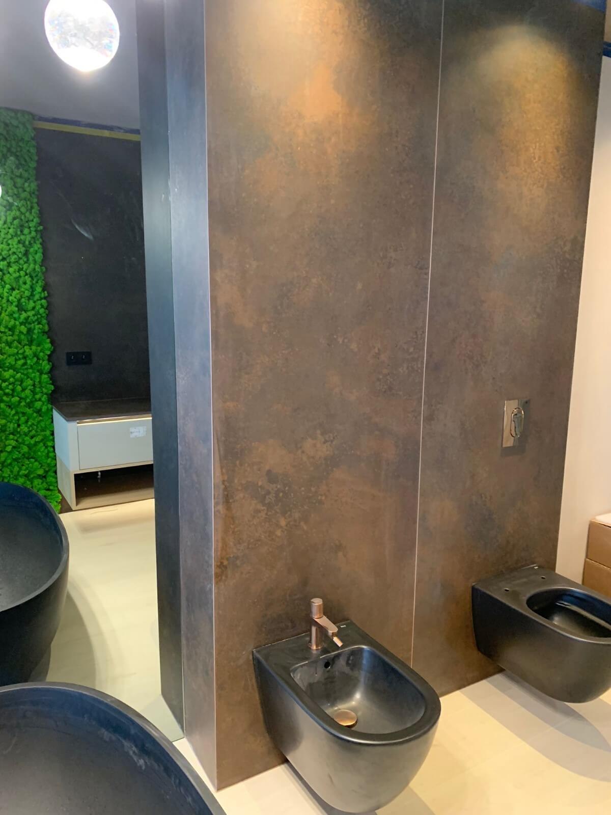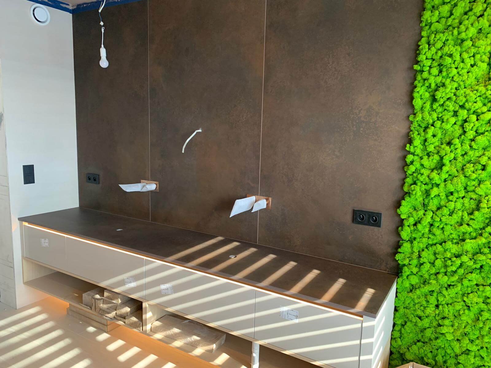 W prezentowanej realizacji kluczową rolę odegrał spiek kwarcowy Laminam Ossido Bruno w wersji matowej. To wyjątkowa propozycja o głębokim, intensywnym odcieniu brązu, który przywodzi na myśl rdzawą fakturę utlenionego metalu. Kolor ten nie jest jednorodny – bogaty w niuanse i delikatne przejścia tonalne, przyciąga wzrok i nadaje wnętrzu wyrafinowanego charakteru. Ciepła głębia Ossido Bruno doskonale komponuje się z naturalnymi dodatkami, co w tej realizacji zostało podkreślone przez zastosowanie żywego mchu Chrobotka na jednej ze ścian.