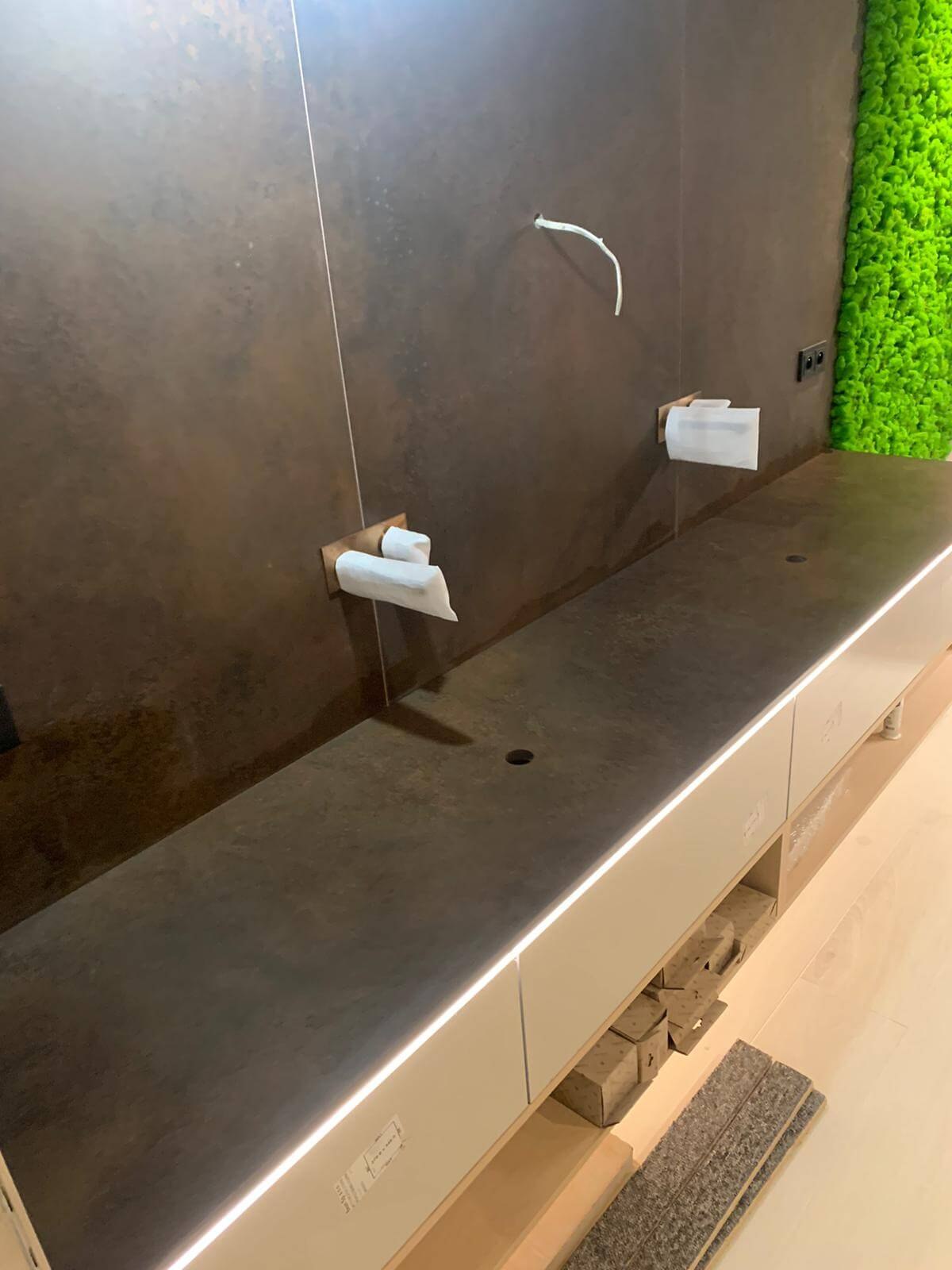 Warto zaznaczyć, że wykorzystano tu spiek kwarcowy w grubości 3 mm do okładziny ściennej oraz 12 mm na blat łazienkowy, co zapewniło zarówno lekkość, jak i trwałość całej konstrukcji. Dzięki precyzyjnemu cięciu wodą możliwe było idealne dopasowanie poszczególnych elementów, a montaż spieków kwarcowych u klienta pozwolił na pełną kontrolę nad każdym detalem.